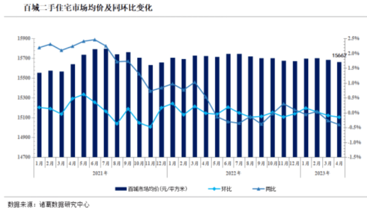 价格方面,据诸葛数据研究中心监测数据,4月100个重点城市二手住宅市场均价为15662元/平方米,环比下降0.15%,较上月扩大0.05个百分点;同比下降0.4%,较上月扩大0.13个百分点。