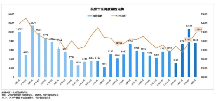 据杭州贝壳研究院数据,包含临安和自主成交数据,4月份杭州二手房成交量为7635套,环比3月份破万套的成交量下跌约30%,不过同比去年4月份增长量达82%。