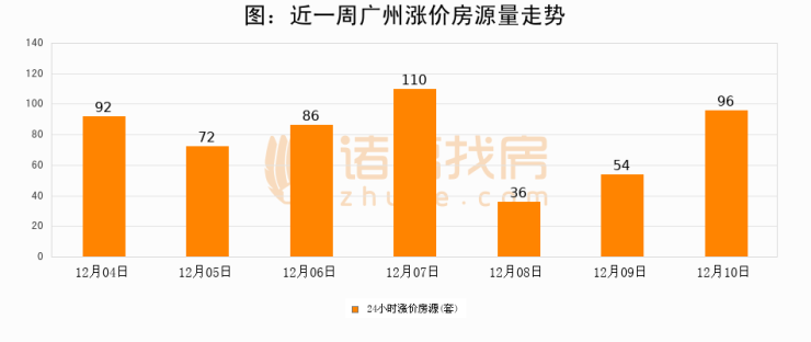 根据诸葛找房数据显示,广州24小时涨价房源量为96套,较12月09日增加42套,环比上涨77.8%。与此同时,涨价房源占比小幅扩大,业主信心有所提升。