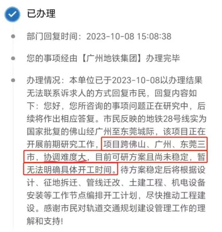 10月8日,广州地铁集团回复:该项目正在开展前期研究工作,项目跨佛山、广州、东莞三市,协调难度大,目前可研方案且尚未稳定,暂无法明确具体开工时间。