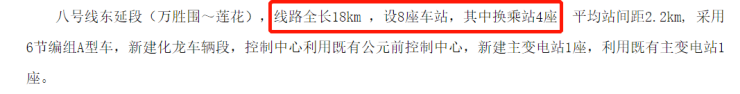 关于8号线东延段,工程概况中提到,线路全长18km ,设8座车站,其中换乘站4座。