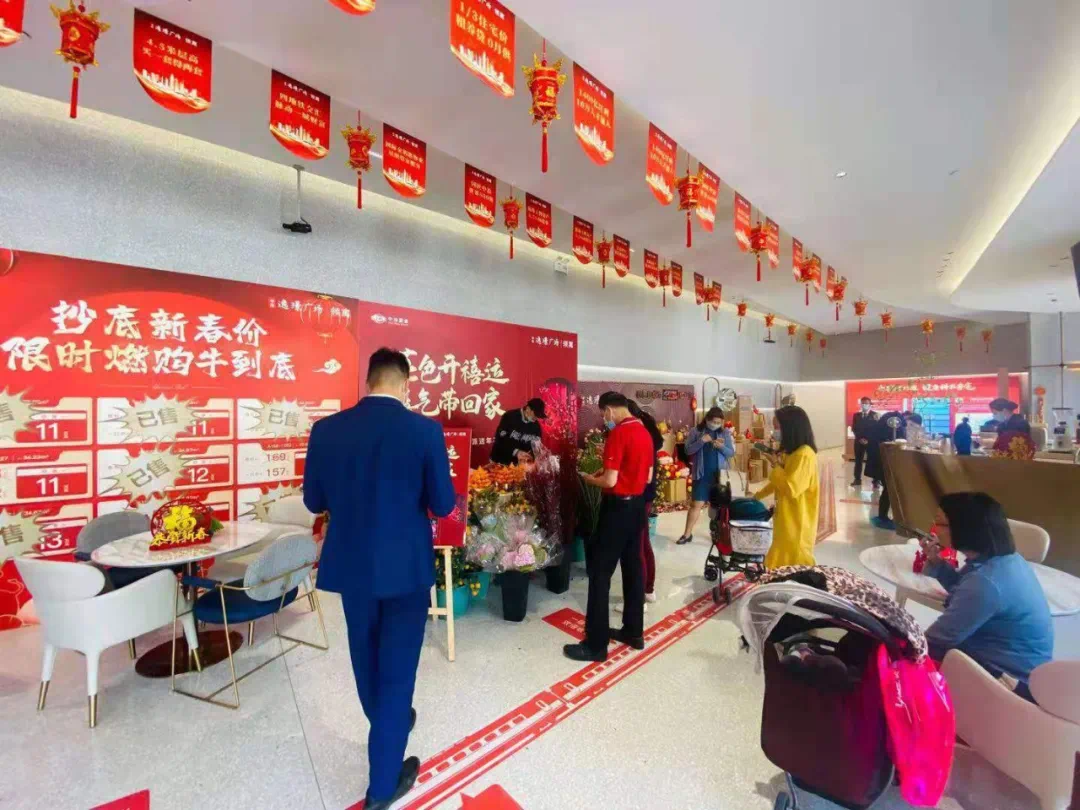 经过多番打听后获悉,春节期间楼盘照常营业,主推建面约90-187㎡三至四房,均价2.8万-2.9万元/㎡。在项目春节优惠的吸引下,每日约有80多组客户来访,也难怪人气如此火热。