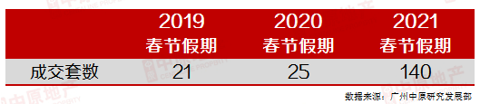 据广州中原研究发展部数据显示,春节期间(2021年2月11日-2月17日),广州累计网签一手住宅单位共140宗,比2020年同期增加4.6倍,比2019年增加6倍,可见今年买家的入市步伐在过年亦未停歇。
