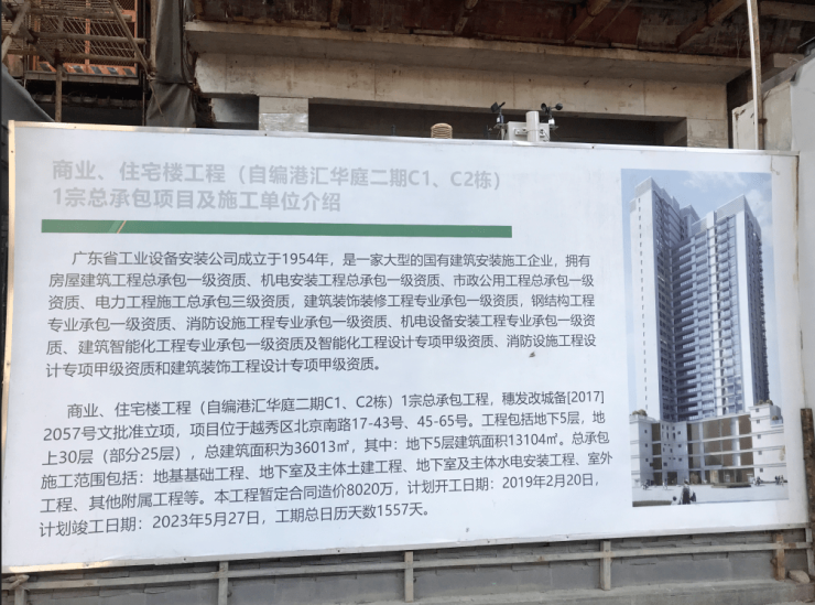 工地外墙公示信息显示,项目包含商业、住宅楼两大部分,其中住宅楼分为相连的C1、C2栋,高25-30层,另外还有多达5层的地下室,工程整体计划今年5月竣工。