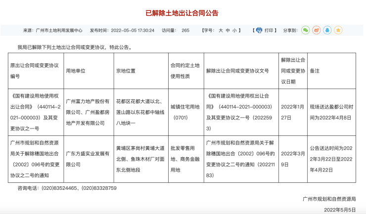 据广州市土地利用发展中心消息,该中心已经与广州富力地产股份有限公司和广州盈都房地产开发有限公司就花都区花都大道以北、莲山路以东花都中轴线八地块一解除土地出让合同或变更协议。