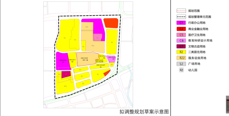 其中有AD13306地块调整为二类居住兼容服务设施用地。地块容积率在1.8-3.35之间,建筑密度在25%-35%;为避让历史建筑、以及幼儿园现状需保留建筑,地块建筑控高在20-30米之间。