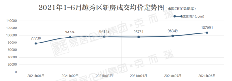 成交均价看,截至6月底,越秀区新房成交均价为10.7万/㎡,同比上涨51.06%,环比上涨8.89%。