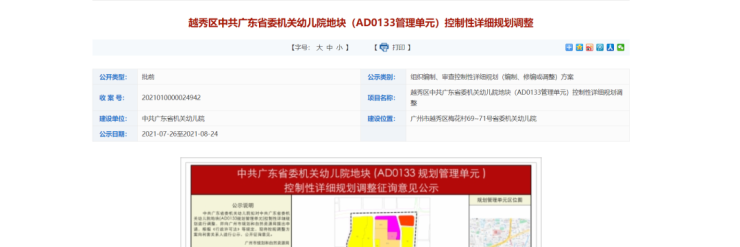 7月26日,广州规划和自然资源局对越秀区中共广东省委机关幼儿院地块(AD0133管理单元)控制性详细规划调整发布批前公示。