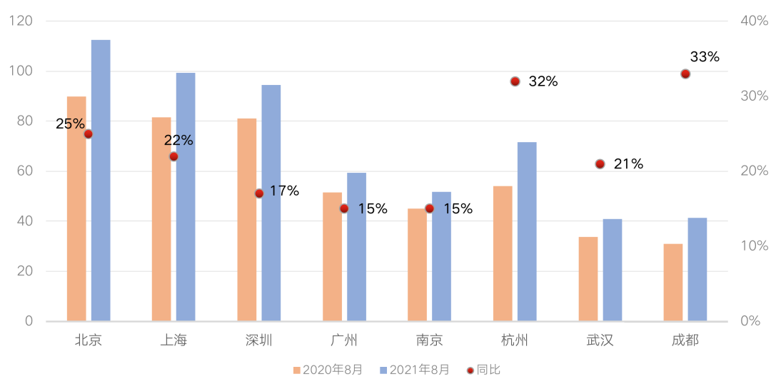 8月,核心八城租金水平较7月有所下降,平均租金为71.4元/平米/月,环比微降2.3%,但相较于2020年同期仍有22%的涨幅,但各城市租金涨幅增速有所放缓,其中成都同比增长33%,较7月同比增速下降7个百分点。