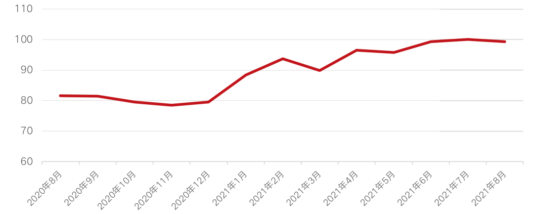 2021年以来,上海的个人房源平均租金整体呈现上升状态,从去年同期的81.67元/平米/月上涨至2021年7月的100.04元/平米/月,租金水平打破近两年记录,并保持连续7个月上涨,同比上涨了22.49%。至8月,上海租金水平有所下降,但仍然保持99.34元/平米/月高位。