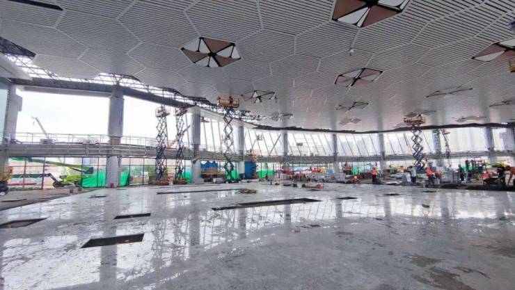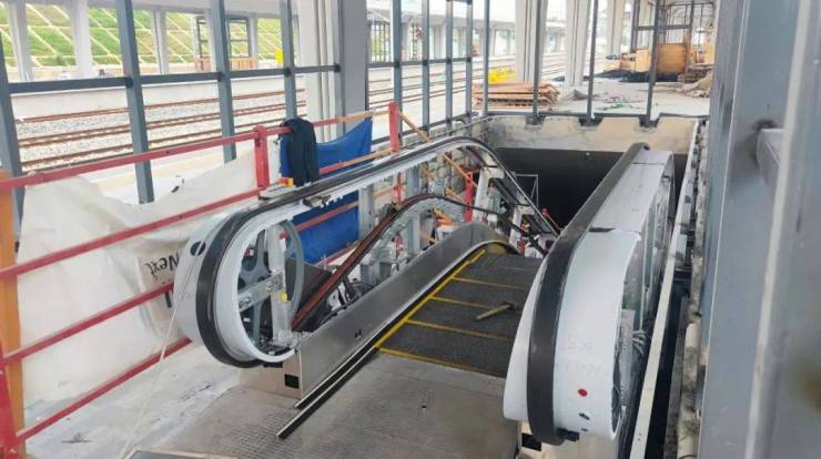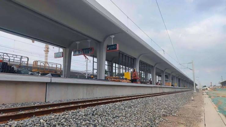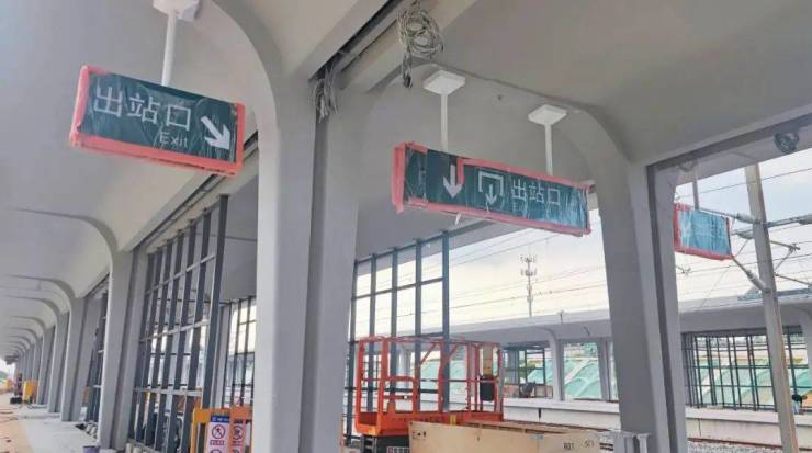 目前,增城南站主体建筑正在进行内外装饰装修、铺设天花地砖,候车站台正在安装指示标识以及安装上下扶手电梯。