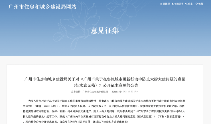 刚刚,广州市住房和城乡建设局发布了关于对广州市关于在实施城市更新行动中防止大拆大建问题的意见(征求意见稿)公开征求意见的公告。