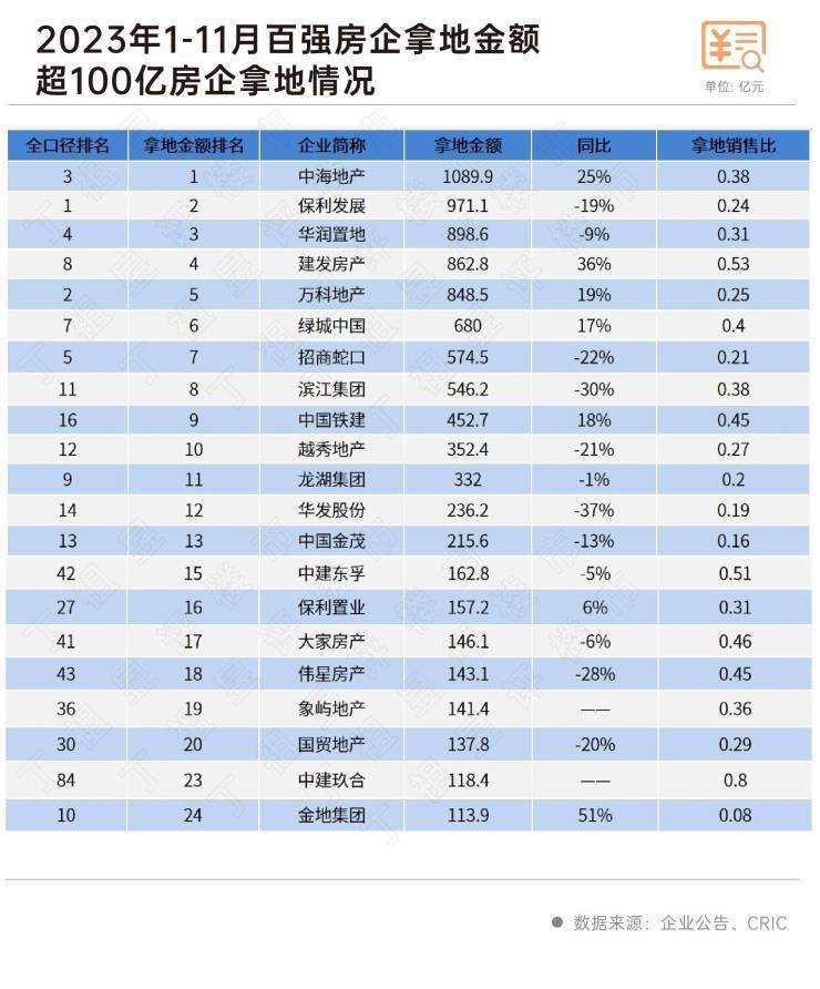 具体来看,1-11月,中海地产拿地金额超过千亿的房企,拿地金额为1089.9亿元,同比增长25%。另外,其余央国企比如建发房产、中国铁建等不仅拿地金额较高,投资金额较2022年同期上涨,同比涨幅分别为36%和18%。