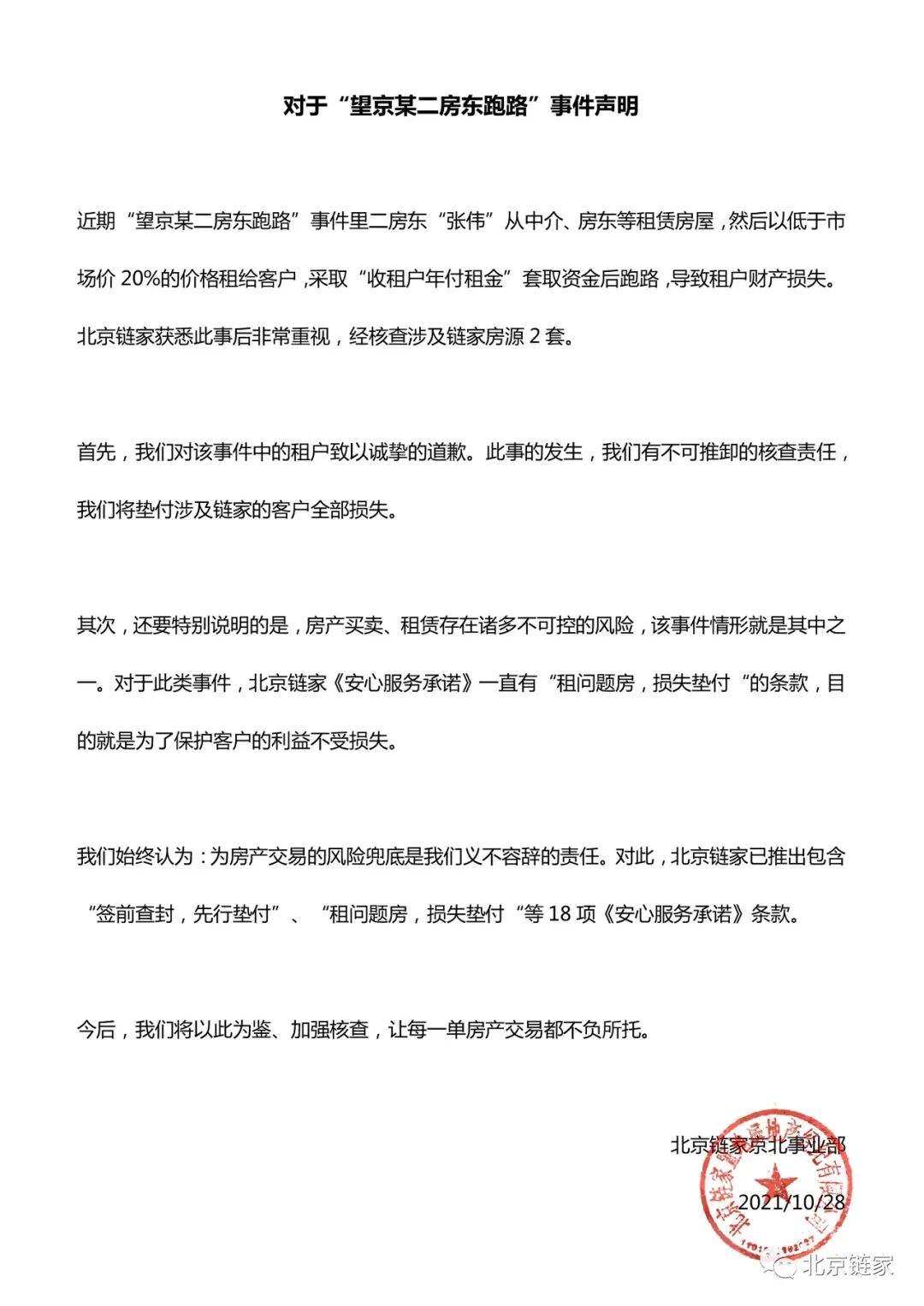 北京链家10月28日发布关于“望京某二房东跑路”事件的声明:“望京某二房东跑路”一事,经核查,其中涉及链家房源2套,我们将垫付该房源所涉客户的全部损失。再次向事件中的租户致以诚挚的歉意!我们将以此为鉴、加强核查,让每一单房产交易都不负所托。
