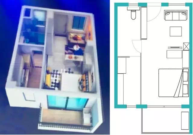 39㎡1房1厅1卫,实则是一个单间设计,但有独立的厨卫,也配备有专门的阳台,相对来说更加人性化。