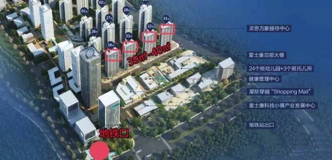 从项目图中可以看到,项目首期除了33栋住宅外,还有富士康总部大楼、24班幼儿园、3班托儿所、健康管理中心、购物中心、富士康科技小镇产业发展中心等配套设施。
