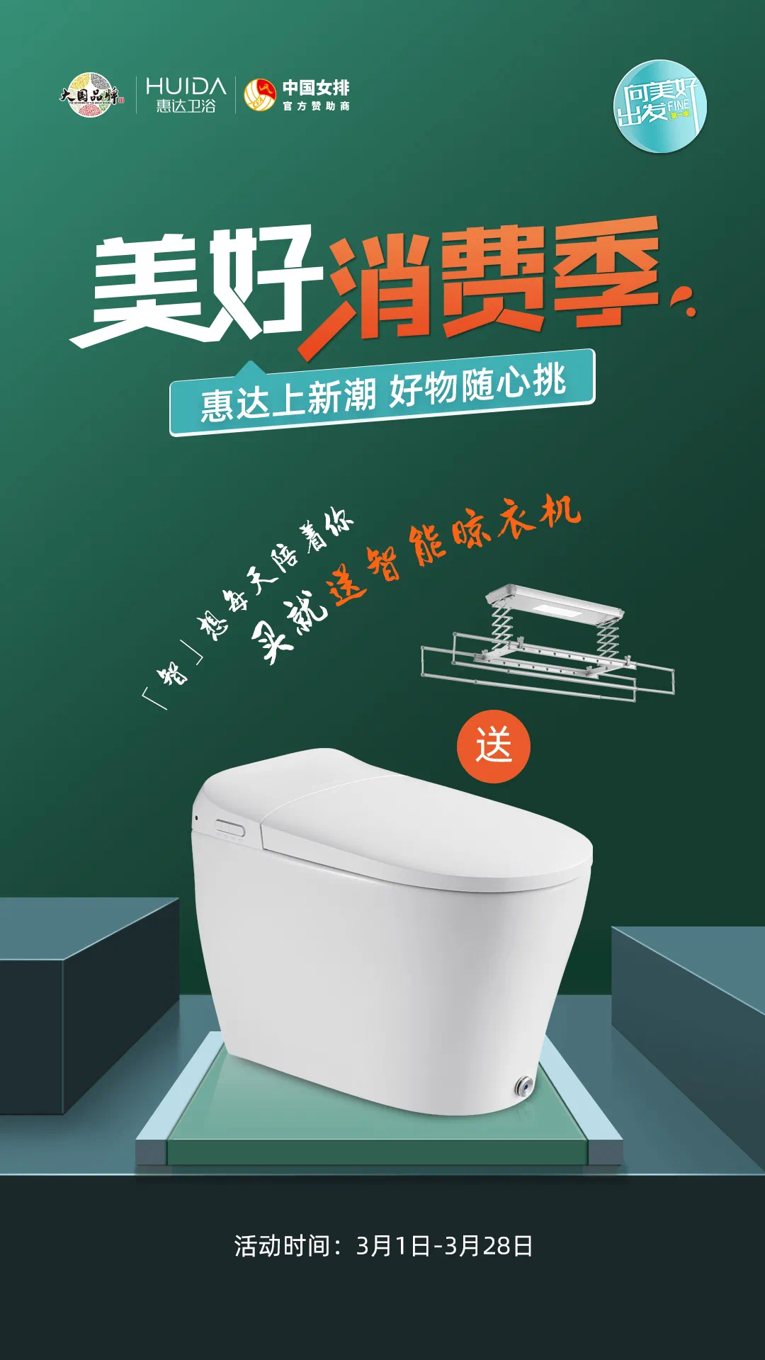 3月1日-28日,惠达超值爆款智能马桶、花洒、浴室柜、淋浴房、智能晾衣机等超多好物全国一口价,紫外线杀菌智能马桶HDE3009T2,买就送指定智能晾衣架,另有多款有颜新品浴室柜、花洒等强势登场,超值礼券、满额立减、进店有礼、限量折扣……为您带来潮流卫浴生活体验,让消费更随心所欲,让购物更物超所值。