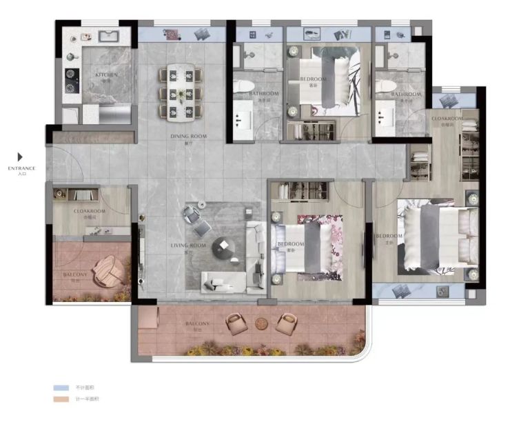如果你是二胎家庭,也有更多的预算,那么建面约135㎡四房两厅两卫,没有什么好挑剔的,可以直接冲。
