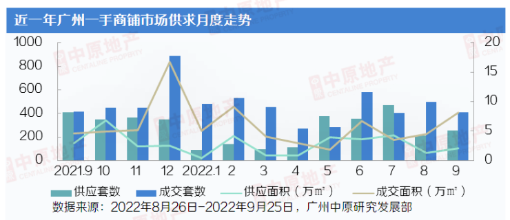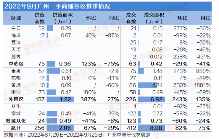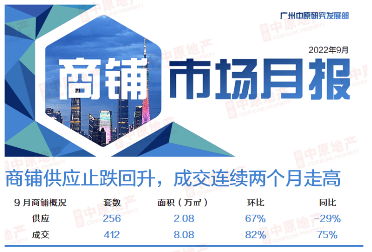 9月广州楼市批售大幅增加,商铺市场供应止跌回升,入市256套2.08万㎡,供应量环比上涨67%。