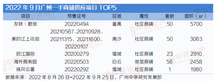 番禺区友联•君御、南沙区美的江上沄启供应量排前,分别入市0.57万㎡、0.31万㎡的社区商铺。