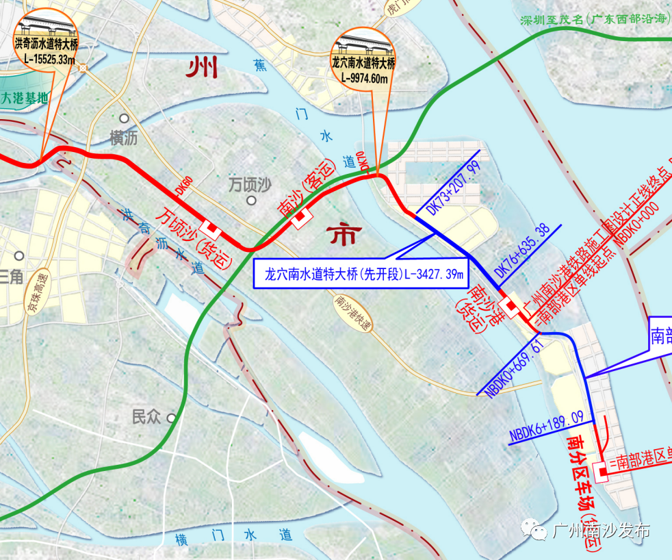 新增南沙站与地铁万顷沙站相邻南沙港铁路自位于龙穴岛上的南沙港站引出后,经龙穴南水道特大桥进入珠江街,沿珠江街七涌北侧行进,在大致新广七路北侧设南沙站办理客运作业,跨越南沙港快速后折向西北,在万环西路东侧设万顷沙站。
