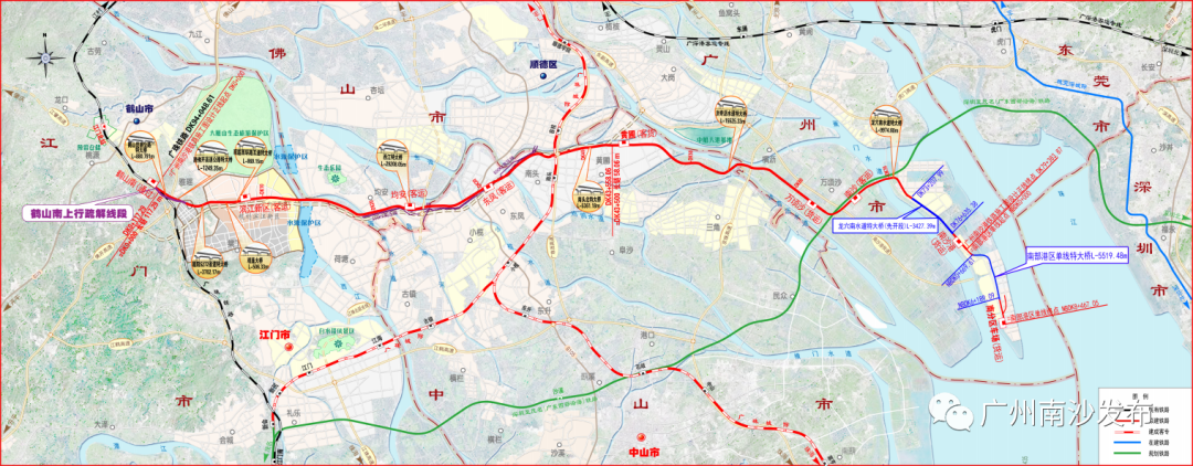 新建广州南沙港铁路线路平面示意图出南沙区后,南沙港铁路跨洪奇沥水道往西行进,沿线在中山设黄圃站、东凤站,在佛山顺德设均安站,在江门设滨江新区站,皆具备客运功能。