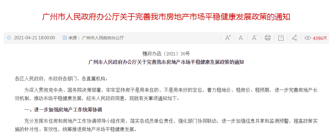 继4月2日新政出台,4月21日,影响面更广,力度更大的调控新政《广州市人民政府办公厅关于完善我市房地产市场平稳健康发展政策的通知》(下简称“通知”)于18点正式公布。