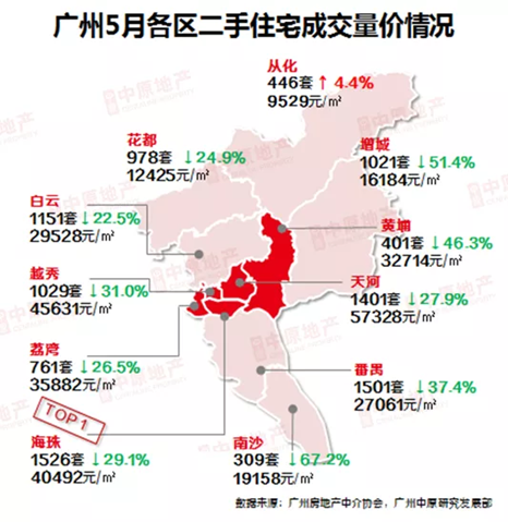 在二手房方面,由于受增值税影响较大,使得市面上符合条件的房源数量急剧下滑,新政降温作用也更加明显。人气火爆的南沙、黄埔五月二手网签套数几近腰斩,下跌幅度分别位列全市排名前列、第二名。