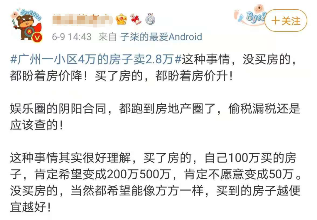 某知名大V表示,娱乐圈的阴阳合同,都跑到房地产圈了,偷税漏税还是应该查。