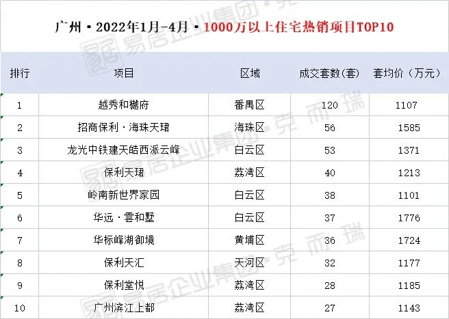 若以1000万元为门槛,今年前四个月广州千万豪宅销售TOP10项目多分布在白云区和荔湾区。