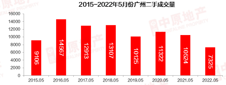 据广州中原研究发展部监测,5月广州二手住宅成交量(自助网签+中介网签)为7325宗,环比2022年4月同期(7274宗)环比微涨0.7%,同比大减30.4%。