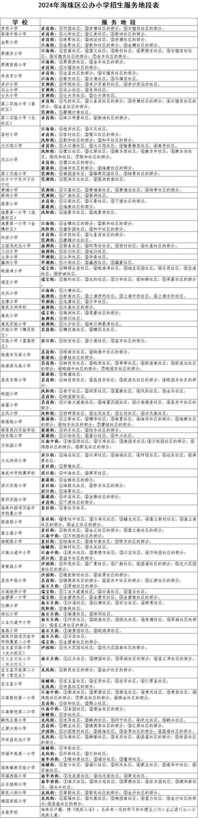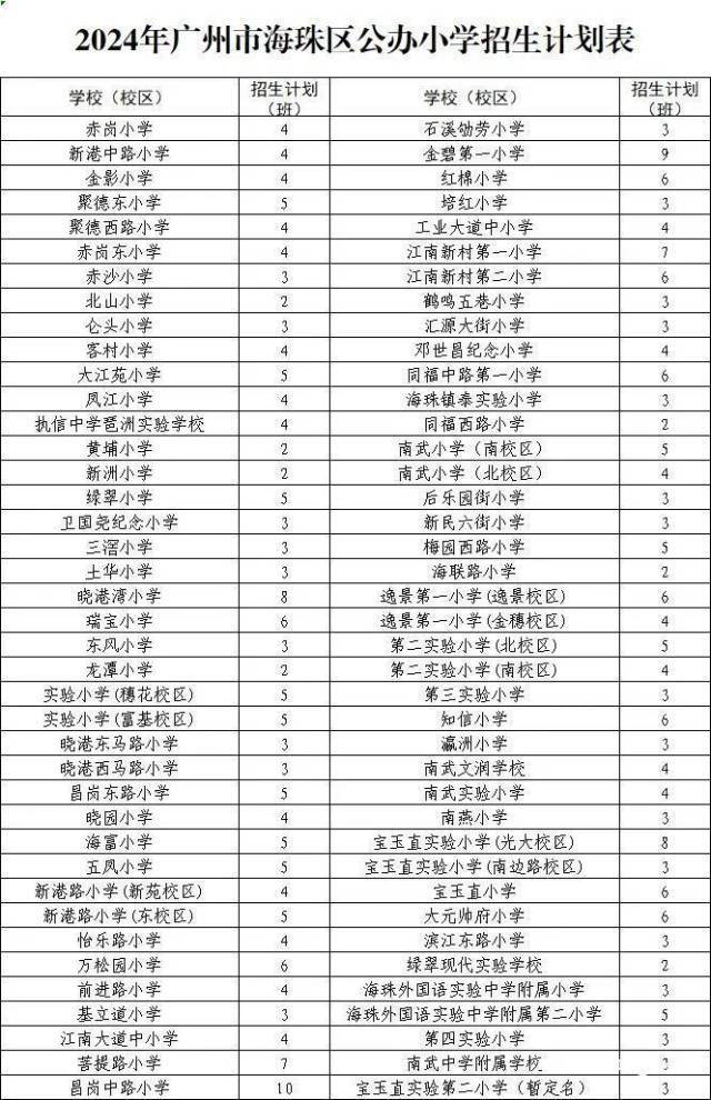 4月30日,海珠区教育局公布《2024年广州市海珠区义务教育学校招生工作实施细则》,并同时发布了海珠区初中、小学招生计划及招生工作日程安排。