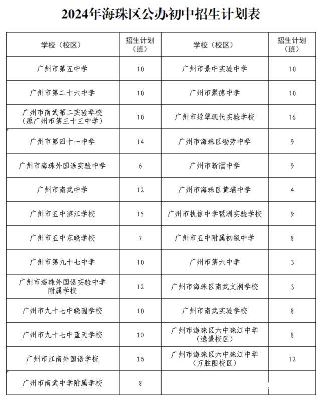 今年海珠区共有27所公办初中,计划招收259个班,比去年增加了27个。其中,广州市五中滨江学校较去年增加3个班;广州市第五中学、广州市第九十七中学、广州市南武中学附属学校、广州市南武实验学校、广州市海珠区六中珠江中学(逸景校区)、广州市海珠区六中珠江中学(万胜围校区)、九十七中晓园学校等学校较去年各增加2个班;广州市第六中学、广州市九十七中蓝天学校、广州市第二十六中学、广州市聚德中学、广州市景中实验中学、广州市南武第二实验学校、广州市执信中学琶洲实验学校、广州市海珠区南武文润学校、广州市海珠区劬劳中学、广州市五中东晓学校等较去年各扩招1个班。