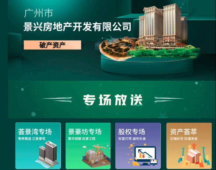 7月5日,京东拍卖平台显示,广州市景兴房地产开发有限公司的破产资产上架,包括江景豪宅爱群荟景湾部分房源、在建工程景豪坊东区、股权、名下知识产权等,将于7月26日-27日(延时的除外)进行拍卖。
