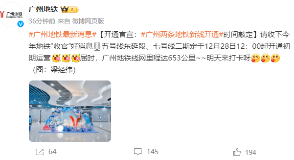 广州地铁发布消息,五号线东延段、七号线二期定于12月28日12:00起开通初期运营。届时,广州地铁线网里程达653公里。