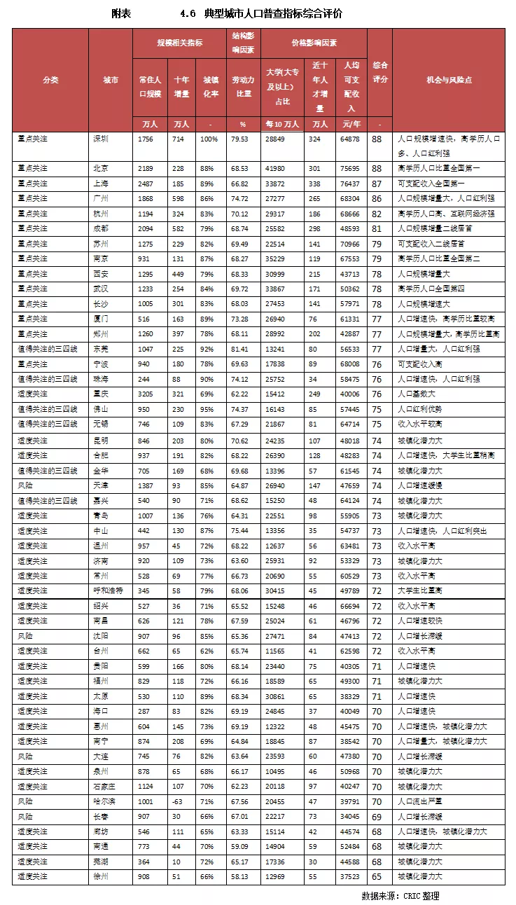 为了对TOP50城市房地产市场前景有一个相对客观、综合的评价,基于上文的研究,我们从规模、结构和房价三个维度选取了常住人口规模、近十年人口增量、城镇化率、劳动力比重、高学历人口比重、高学历人口增量和收入水平等七个指标,并赋予各影响因子适当的权重,从人口角度构建了一个相对客观的综合评价体系,将50个样本城市分为重点关注的城市、适度关注城市、风险城市以及表现突出的三四线城市。(详见文末附表)