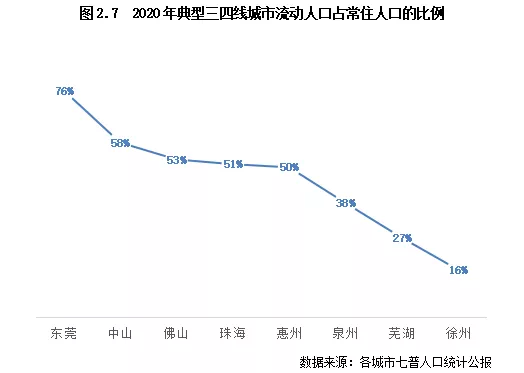 三四线城市方面,上文中提到的人口结构最为年轻的大湾区城市,如东莞、佛山等,流动人口规模也显著高于其他三四线城市。同时,这些城市的流动人口占常住人口的比重均超五成以上,尤其是东莞,流动人口占比已高达76%。因此,这些城市中外来人口的购房需求已成为当地购房主力。