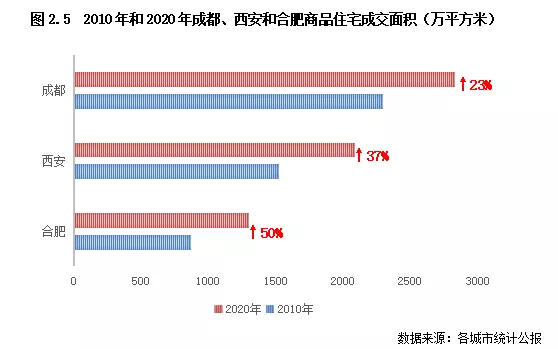 二线城市中,成都、重庆、合肥等中西部城市在“强省会”战略支持下经济发展迈入快速通道,城市吸引力也显著提升,流动人口规模较十年前均显著增加,如成都、合肥和西安2020年的流动人口规模较十年前均增长了一倍以上,增量都在200万以上。在此影响下,当地住宅成交规模也快速增长,至2020年这三个城市的商品住宅成交面积均超过了1000万平方米,较十年前涨幅均在20%以上。