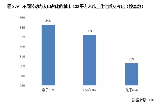 结合年龄结构来看,虽然不同城市之间基本面差异较大,但劳动力占比越高的城市,中大面积段的产品市场份额也相对更高,如劳动力占比高于68%的城市,120平方米以上的产品成交份额平均约34%,比劳动力占比低于65%的城市平均高出了4个百分点。