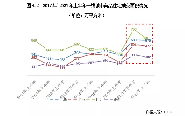 进入2021年,四城的楼市成交热度仍保持在高位;虽然上海、深圳、广州等城市收紧了调控,但四城市2021年上半年的商品住宅成交规模较以往同期仍是上涨的,和2020年下半年相比也仅是小幅下跌。不仅成交量上行,一线城市的成交均价同样也呈现出持续上扬的态势;由此可见,一线城市的楼市韧性之足。