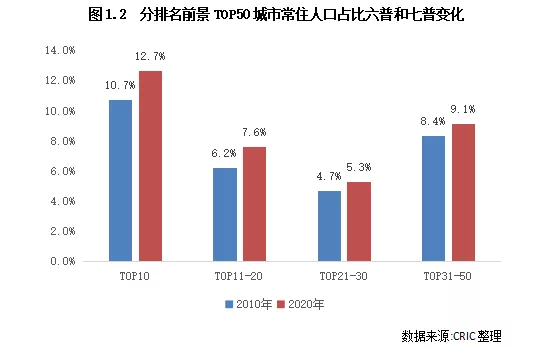 对比六普和七普数据来看,TOP10城市的常住人口占比由2010年的10.7%上涨至2020年的12.7%,提升了2.7个百分点,明显高于TOP10之后的城市。