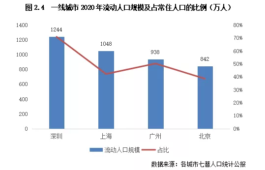 具体到各城市来看。在流动人口规模方面,一线城市规模优势遥遥先进,四个城市的流动人口规模均在800万以上,其中深圳和上海更是超过了1000万,位居典型城市TOP1、2位。在比例方面,“移民城市”深圳以71%的占比位居四个城市首位,是一线城市中少有流动人口规模显著高于本地户籍人口的城市。