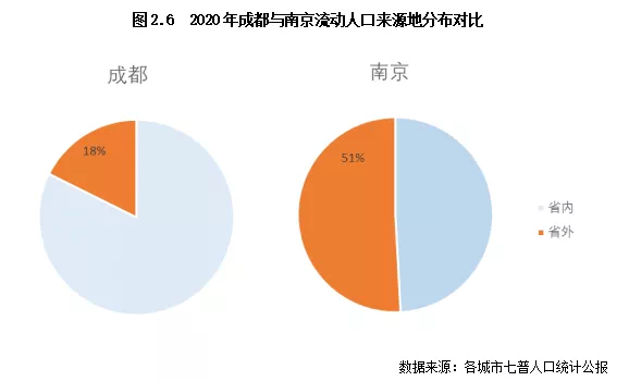 不过,相对于南京、厦门等东部沿海城市,成都、西安等城市对省内人口的吸引力较强,对省外人口的吸引力相对偏弱。如在成都的流动人口构成中,82%来自四川省省内,省外流动人口的占比不足两成,而南京流动人口中则有一半以上来自省外,比例明显高于成都。由此来看,成都等城市对外省人才的吸引力有待进一步提升。