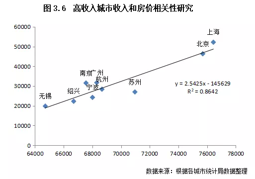 值得注意的是,高收入城市通常也是房价较高的城市,我们将TOP10城市收入和房价进行线性拟合,结果发现,排除深圳一个异常项之后,R2高达0.86,相关性高达0.93。这表明高收入群体对高房价有较强的支撑性,这也与印证了前文提到的收入水平较为突出的京、沪房价同样遥遥先进。