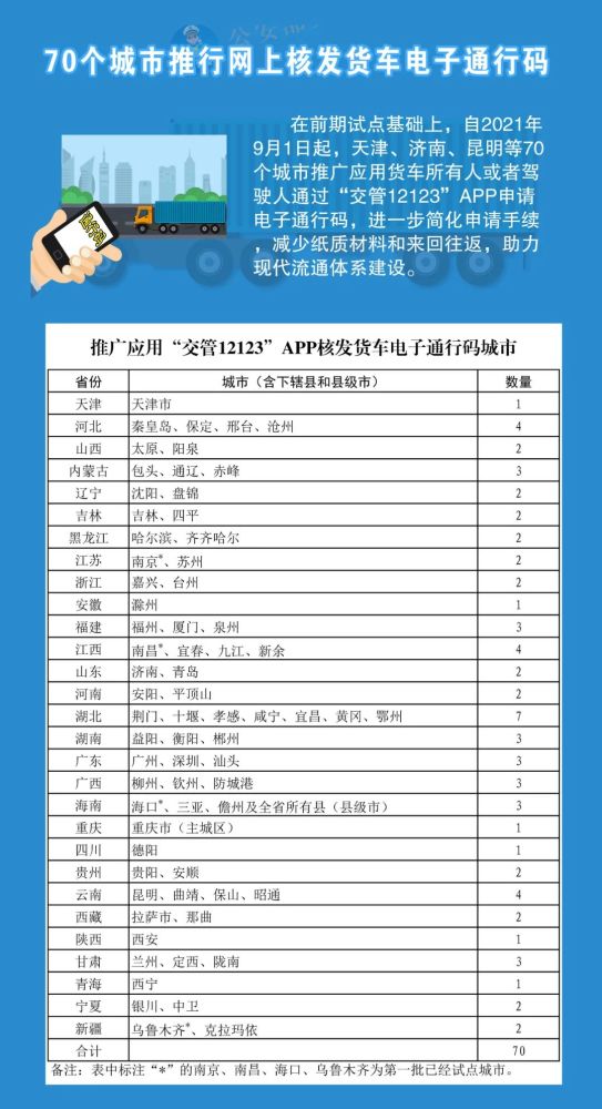 天津等70个城市推行网上核发货车电子通行码。在南京、南昌、海口、乌鲁木齐4个城市试点货车所有人或者驾驶人通过“交管12123”APP申请电子通行码基础上,天津、广州、深圳、汕头等70个城市推广应用“交管12123”APP核发货车电子通行码,进一步简化申请手续,减少纸质材料和来回往返,助力现代流通体系建设。