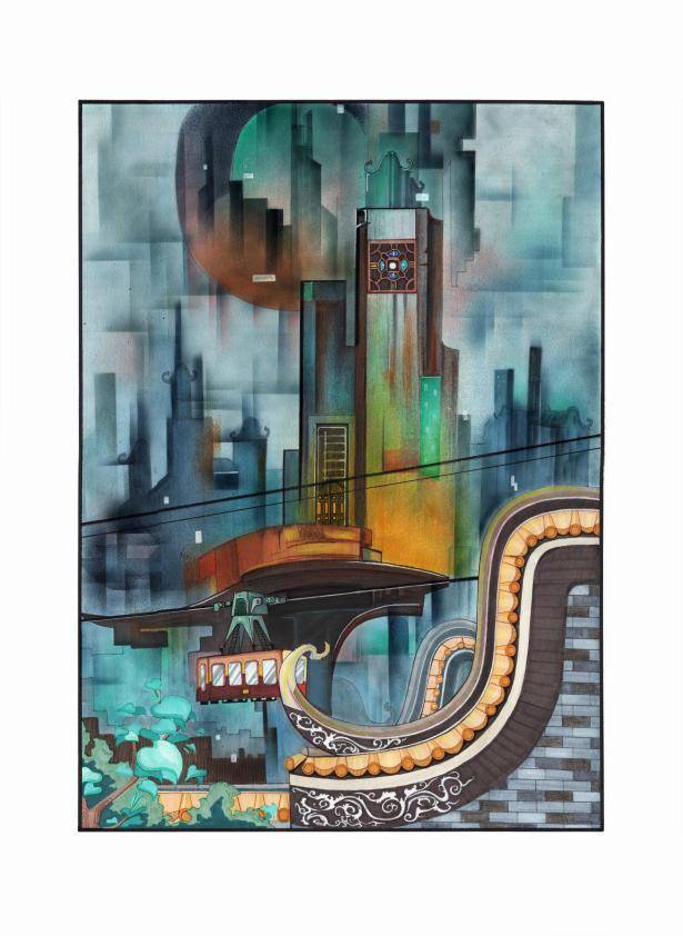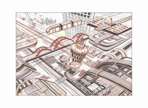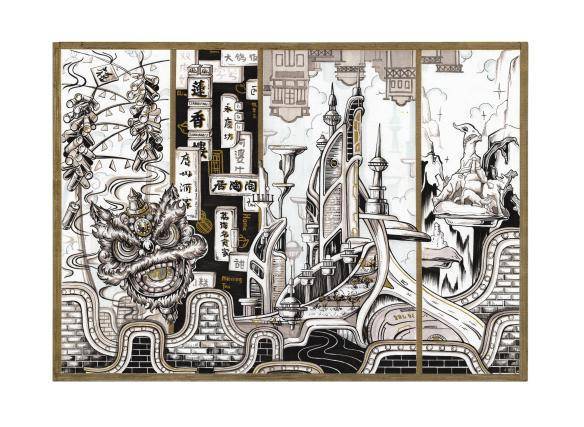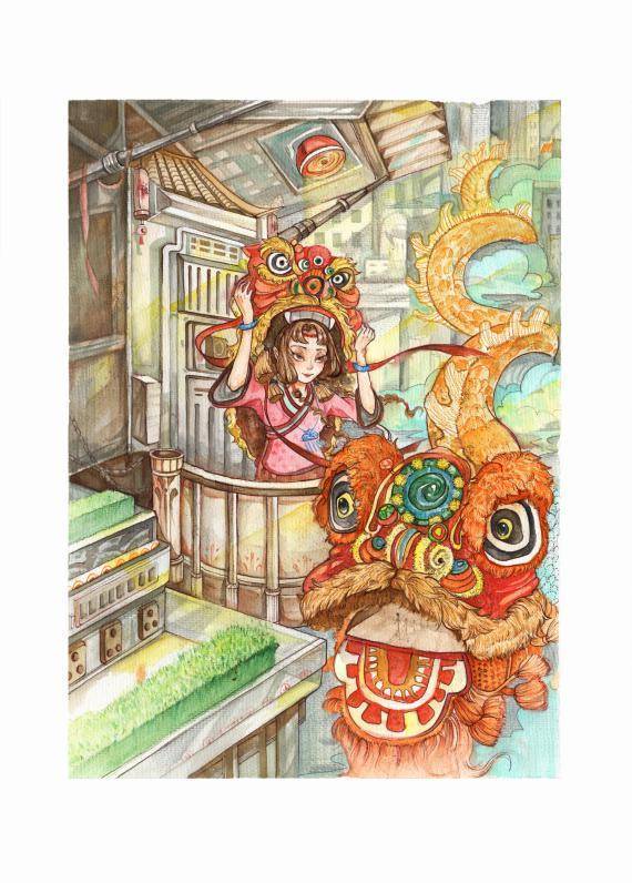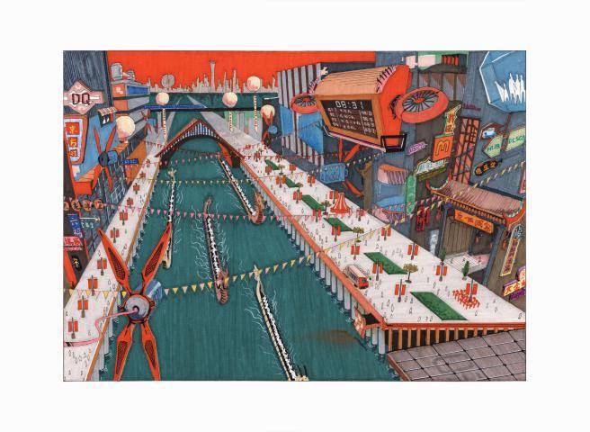 在画作中,我们既可以看到传统的岭南元素,记忆深处里的骑楼、龙舟、舞狮;也可以看未来城市的科幻一面,在空中遨游的龙舟飞行器、突破三维空间的折叠城市、颠覆想像的未来交通方式、城市与传统文化的冲突与融合......