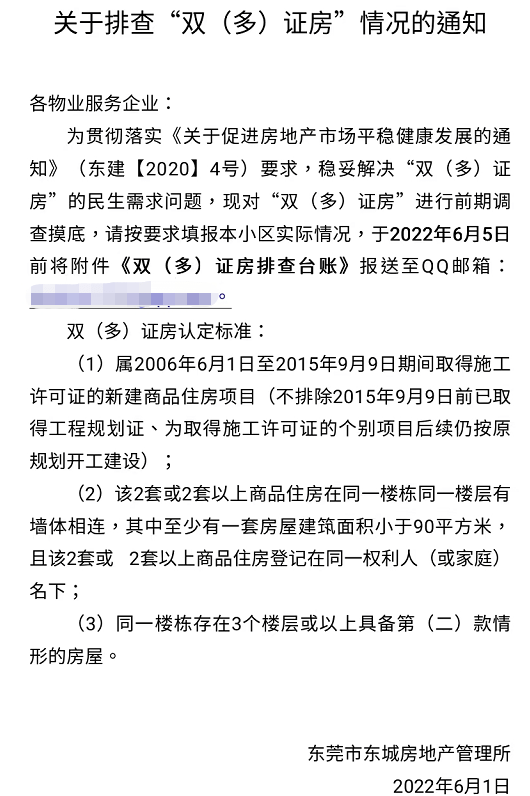 网传截图显示,为贯彻落实《关于促进房地产市场平稳健康发展的通知》(东建【2020】4号)要求,稳妥解决“双(多)证房”的民生需求问题,现对“双(多)证房”进行前期调查摸底,请各物业服务企业按要求填报本小区实际情况,并于2022年6月5日前将附件《双(多)证房排查台账》报送至相关邮箱。