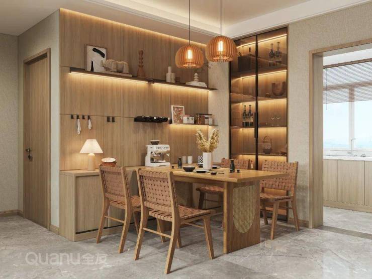 餐厅定制与餐桌齐高餐边柜,墙面用原木饰面+多功能墙面家居装饰,美观实用。另一面墙则内嵌玻璃柜,珍藏美酒。