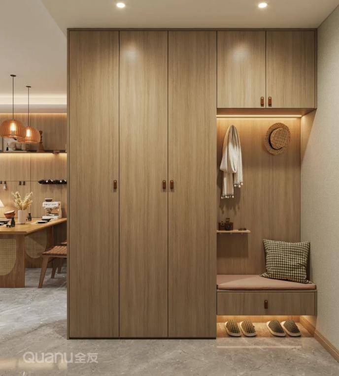 入户处定制到顶鞋柜,超高门板简约大气。卡座底部悬空,换鞋+藏鞋一步到位。扑面而来的原木气息,将生活节奏自然放缓。