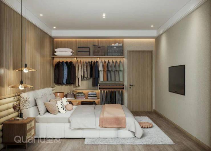 区别于常见的掩门衣柜,温女士的卧室采用了墙挂式衣柜设计,开放布局+悬空置放,衣物一目了然,日常挂取更便捷。